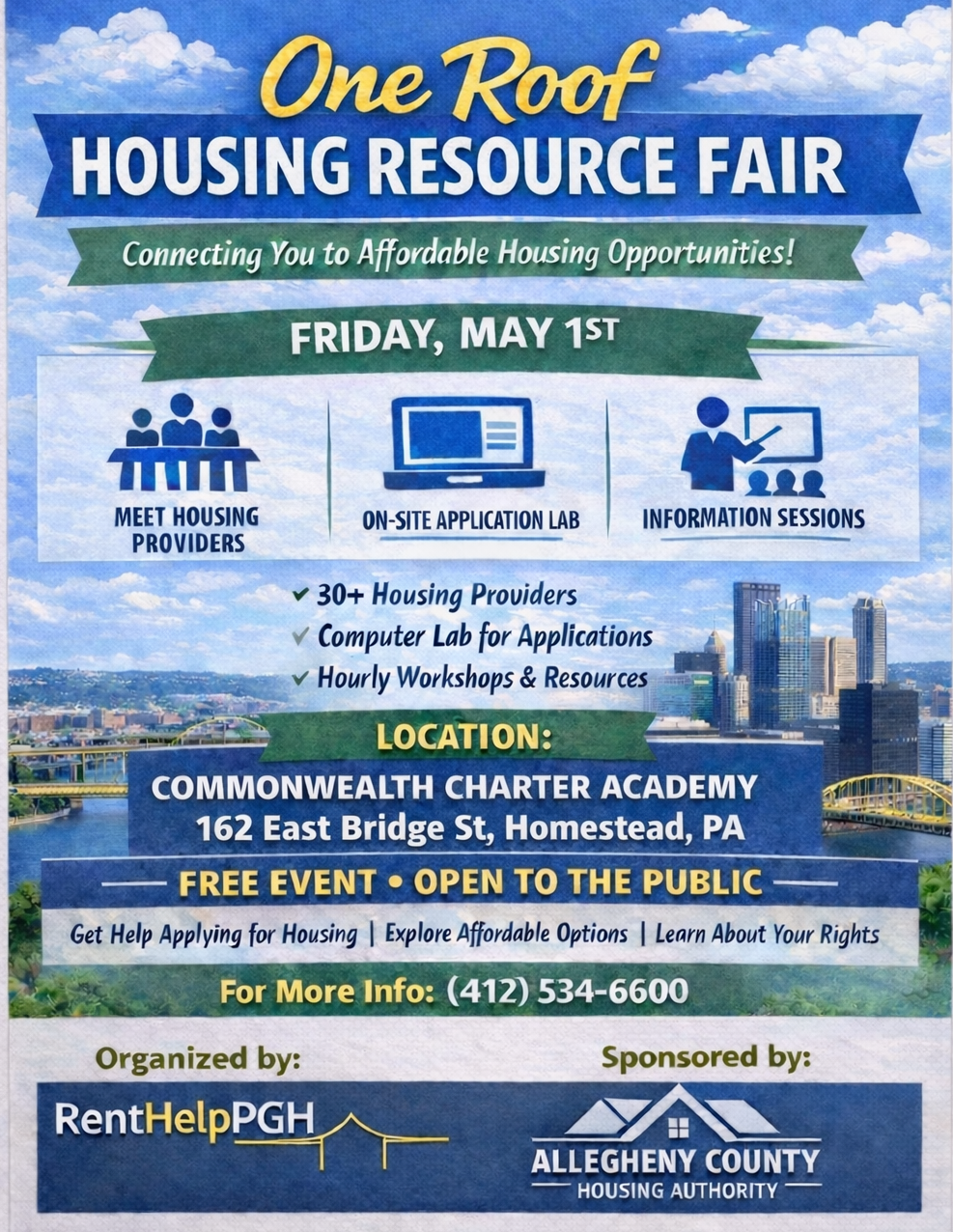The One Roof Housing Resource Fair on May 1, sponsored by Allegheny County Housing Authority and coordinated with RendHelpPGH, is designed to simplify access to affordable housing resources in Allegheny County by bringing together housing providers, support services, and application assistance.